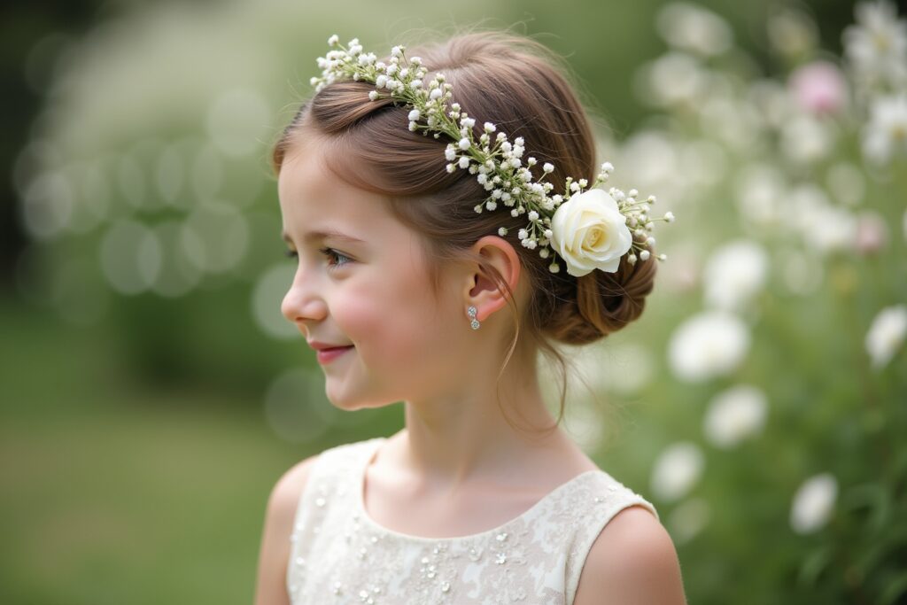 Accessoires spielen eine entscheidende Rolle, um die Frisur des Blumenmädchens zu vervollständigen und sie in das Gesamtbild der Hochzeit einzufügen.